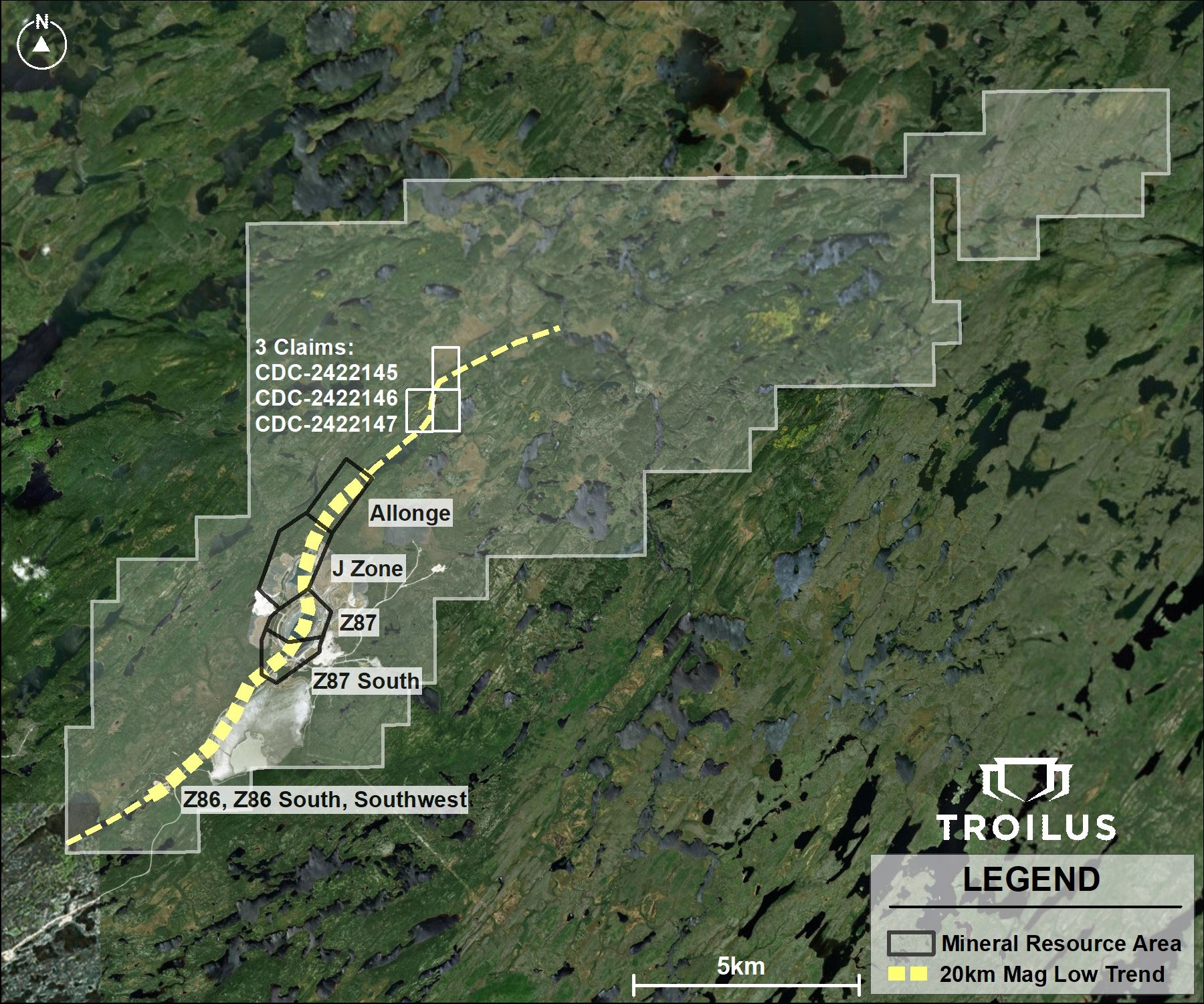 Figure 1: Plan view of Troilus Property Showing new Claims Acquired to the north west of Zone Allonge