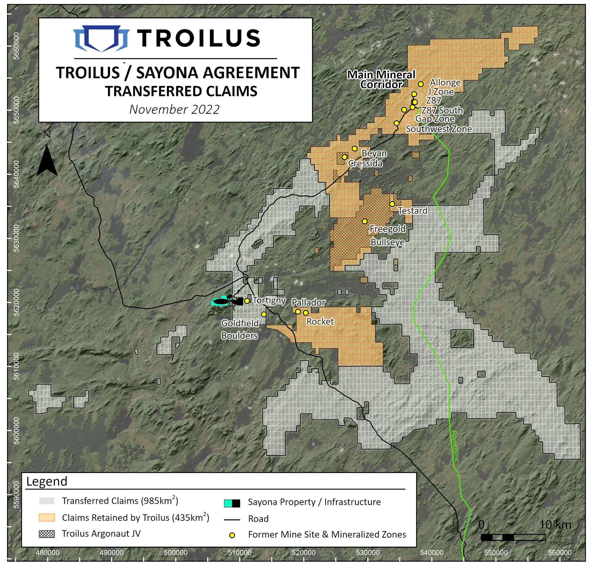 November 16, 2022, Montreal, Quebec – Troilus Gold Corp. (“Troilus” or the “Company”, TSX: TLG; OTCQX: CHXMF) is pleased to announce that the Company has entered into a definitive agreement (the “Agreement”), pursuant to which Troilus has agreed to sell a package of 1,824 claims which represents an area of approximately 985 square kilometres (the “Transferred Claims”) to a subsidiary of Sayona Mining Limited (“Sayona”) by way of an asset sale (the “Sale”). The Transferred Claims do not include any of the claims on which Troilus has a current National Instrument 43-101 (“NI 43-101”) gold and copper resource estimate on which its Preliminary Economic Assessment (“PEA”) from August 2020 was based (the “Main Mineral Corridor”), nor do the Transferred Claims include ground where the majority of recent exploration activities were undertaken by Troilus (see Figure 1). The Transferred Claims do include land that currently hosts the Tortigny deposit, which is located adjacent to existing Sayona properties and infrastructure, including its Moblan Project (see Figure 1).
