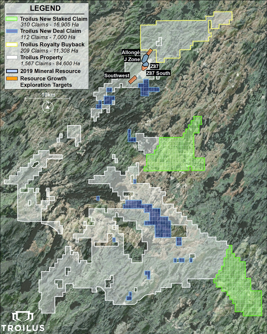 July 21, 2020, Toronto, Ontario – Troilus Gold Corp. (TSX: TLG) (OTCQB: CHXMF) (“Troilus” or the “Company”) is pleased to announce that through acquisition and staking it has added 422 new claims to the Troilus property, expanding the land position by 23,005 hectares to a total area of 107,326 hectares (see Figure 1).