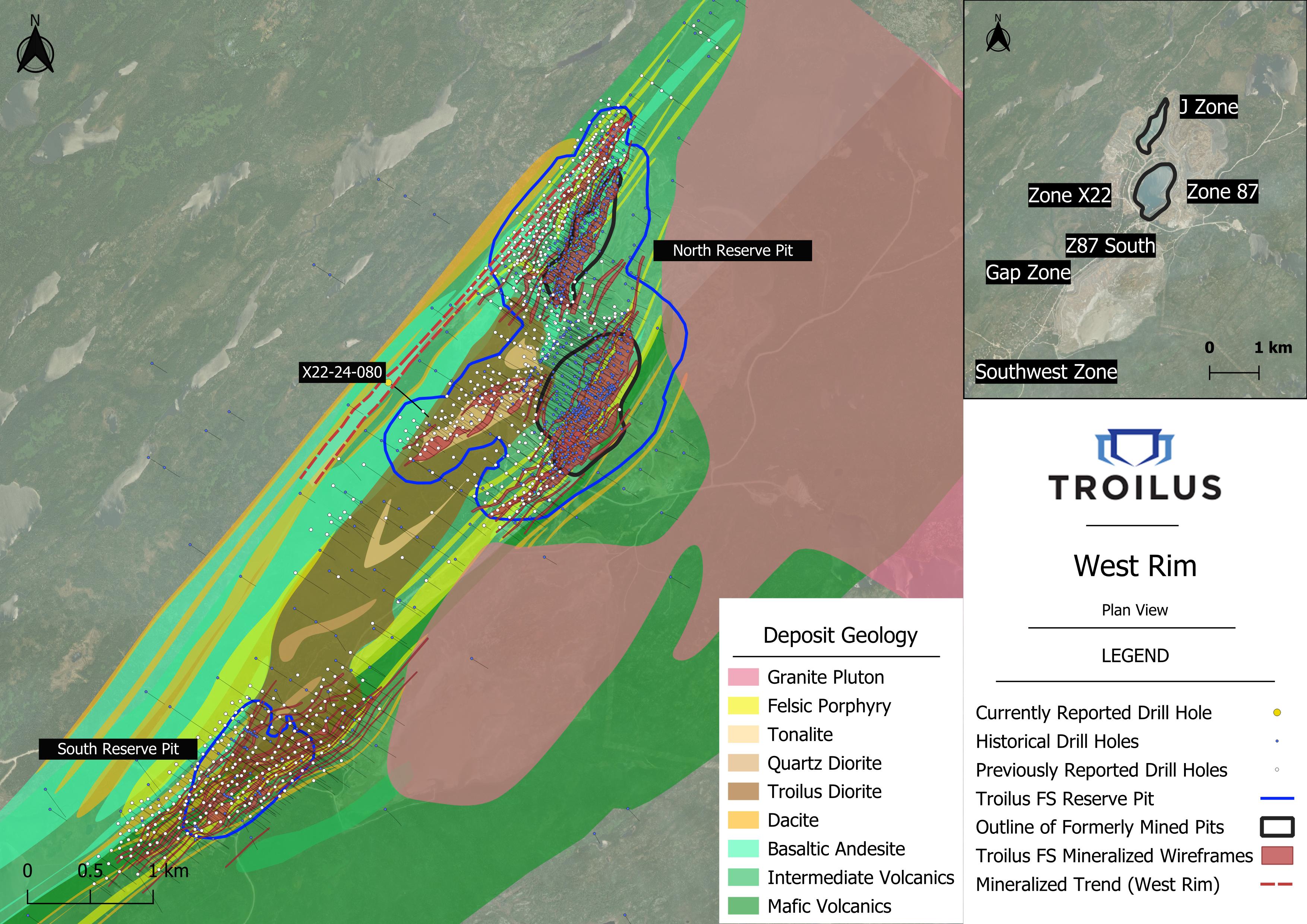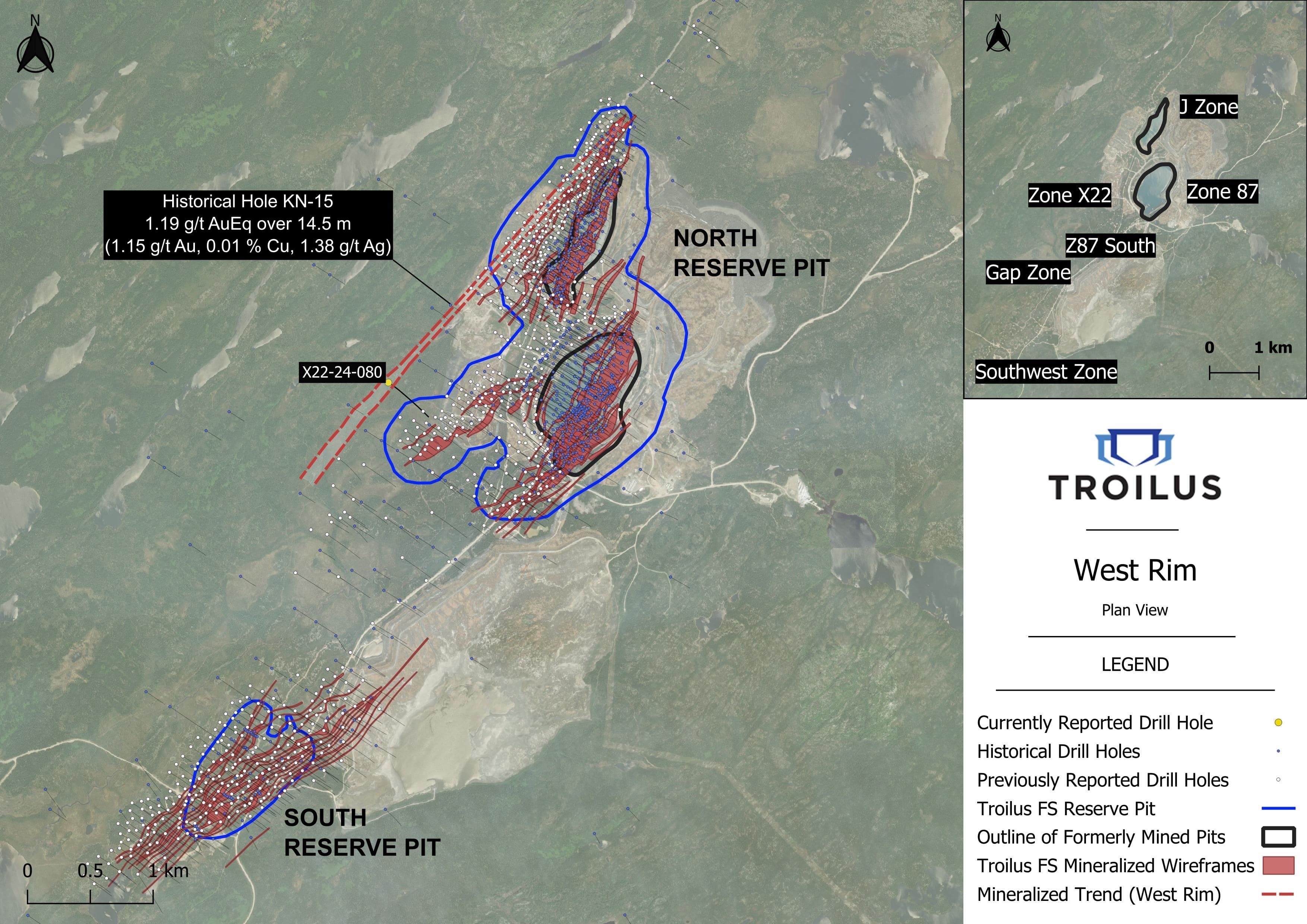 Justin Reid, CEO of Troilus Gold, commented, “After 5 years of systematic exploration, we are still making significant discoveries on the Troilus property. The West Rim target is a testament to the prospectivity and opportunity within proximity to the Troilus project’s mineral reserve pits defined in the recent Feasibility Study (see press release, May 14, 2024)*. Located just 200 meters from the North Reserve Pit and at surface, the West Rim is a highly prospective corridor spanning 4km in length, 1km of which has never been drilled and is open for follow up drilling and delineation of mineralization. Moreover, results from Zone X22 have extended mineralization past 500 meters depth, supporting the future potential of underground development. The geology team has continued to successfully discover and develop existing targets across the property, and we look forward to follow-up drilling in the coming months to build out the West Rim target and further extensions below the North Reserve Pit.”