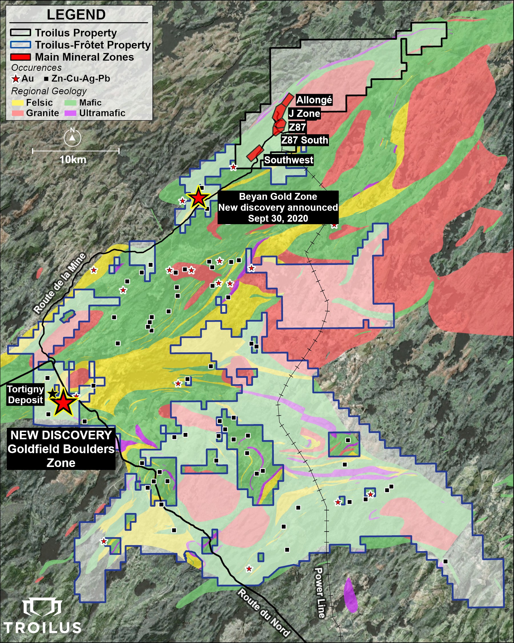 October 8, 2020, Toronto, Ontario – Troilus Gold Corp. (TSX: TLG) (OTCQB: CHXMF) (“Troilus” or the “Company”) is pleased to announce the latest results from its summer 2020 regional exploration program on its 100%-owned Troilus Project, located within the Frôtet-Evans Greenstone Belt of northern Quebec. The program focused on identifying high priority targets within the extensive land package Troilus acquired and staked earlier in the year (the “Troilus-Frôtet Property”) (see press releases dated April 28, 2020 and July 21, 2020). Initial results collected 28 km southwest of the recently announced Beyan Gold Zone Discovery (see press release dated September 30, 2020), have outlined another new zone of mineralization: the Goldfield Boulder Zone (“Goldfield”). Gold bearing boulders and outcrop can be traced and defined in situ over a minimum strike length of 4 km. Goldfield is accessible from the Route du Nord highway.