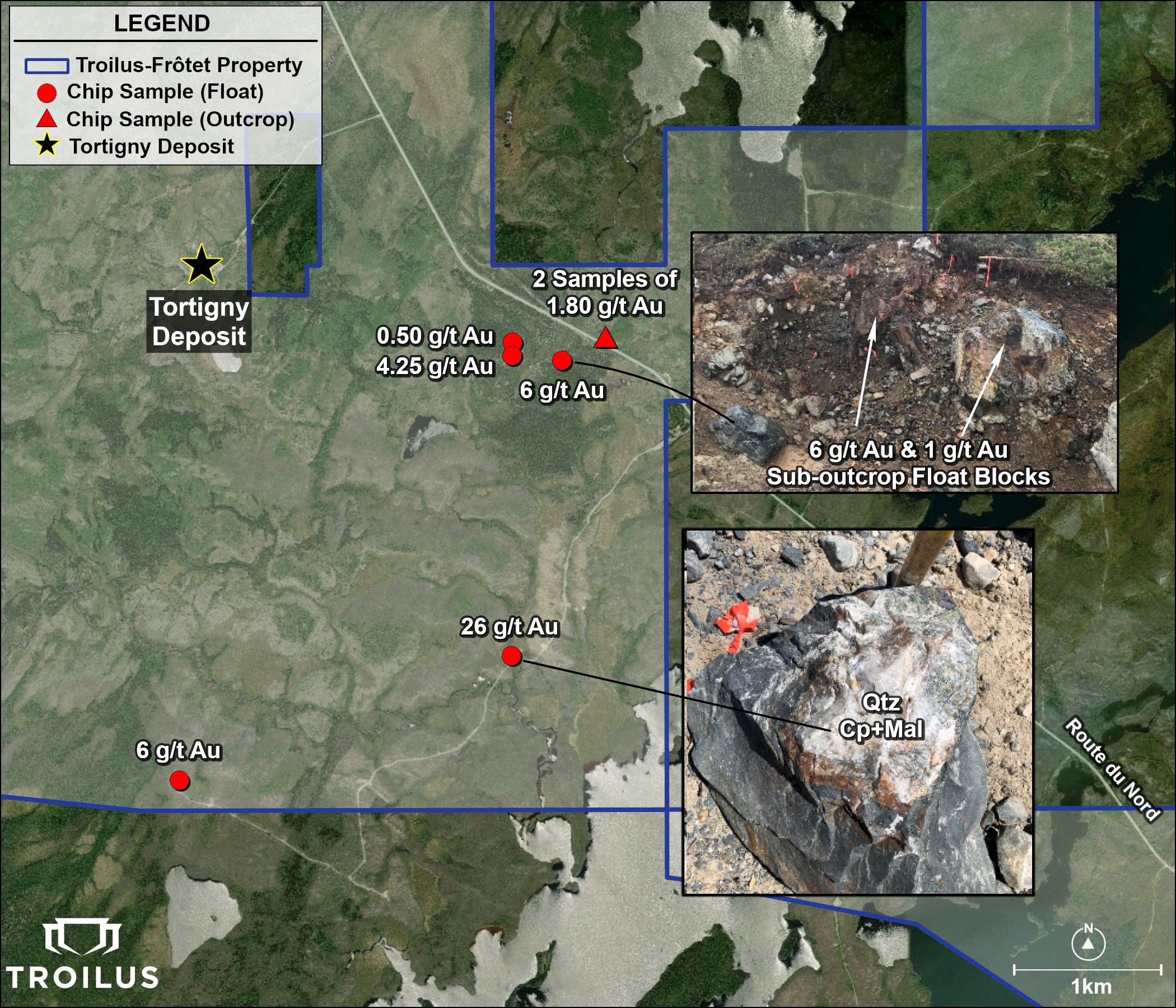 During this initial bedrock mapping and boulder tracing, the Troilus Geological team located several mineralized boulders on the main Tortigny block assaying up to 26 g/t Au with the best results highighted in the Table 1 below. The Tortigny deposit (see Figure 2), now 100% owned by Troilus, was discovered by Noranda in 1994 with an initial mineral resource estimate prepared in 1997. The latest NI 43-101 compliant mineral resource completed by Beaufield Resources in 2014, estimates measured and indicated resources of 1.1 million tonnes grading 1.8% Cu, 3.65% Zn, 48.51 g/t Ag and 0.35 g/t Au and inferred mineral resources of 99,000 tonnes grading 1.19% Cu, 1.23% Zn, 12.45 g/t Ag and <0.1 g/t Au. The Tortigny mineral resource includes 135 drill holes (34,581 metres) and covers a distance of approximately 600 metres. (The Technical Report for the Tortigny deposit titled: "TECHNICAL REPORT FOR THE TORTIGNY POLYMETALLIC PROJECT SOUTHERN JAMES BAY MUNICIPALITY QUEBEC, CANADA" and effective June 2, 2014, was completed by Micon International Limited and can be found on Beaufield Resources SEDAR profile at www.sedar.com). A qualified person has not done sufficient work to classify the historical estimates as a current mineral resource estimate. Troilus is not treating the historical estimates as current estimates and the historical estimates should not be relied upon as current mineral resource estimates. Further drilling would be required to verify the historical estimate.
