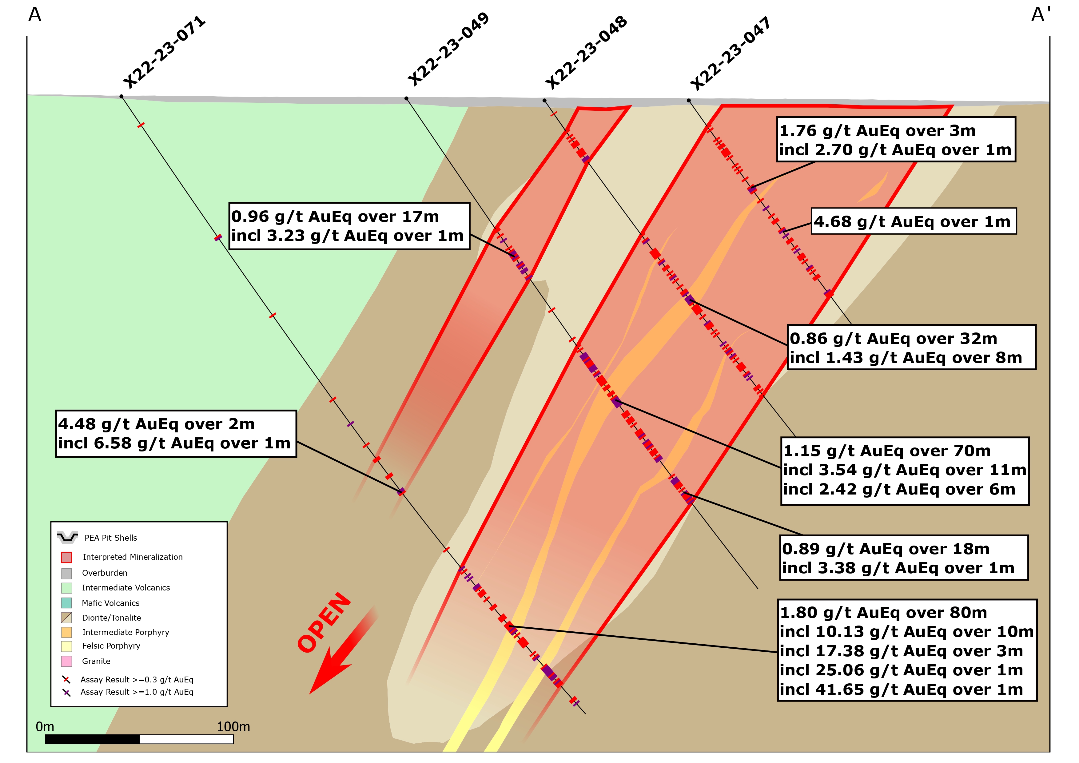 Figure 2: Section 12,625N (A-A’ Figure 1) Showing New Results for Holes X22-23-047, X22-23-048, X22-23-049 and X22-23-071