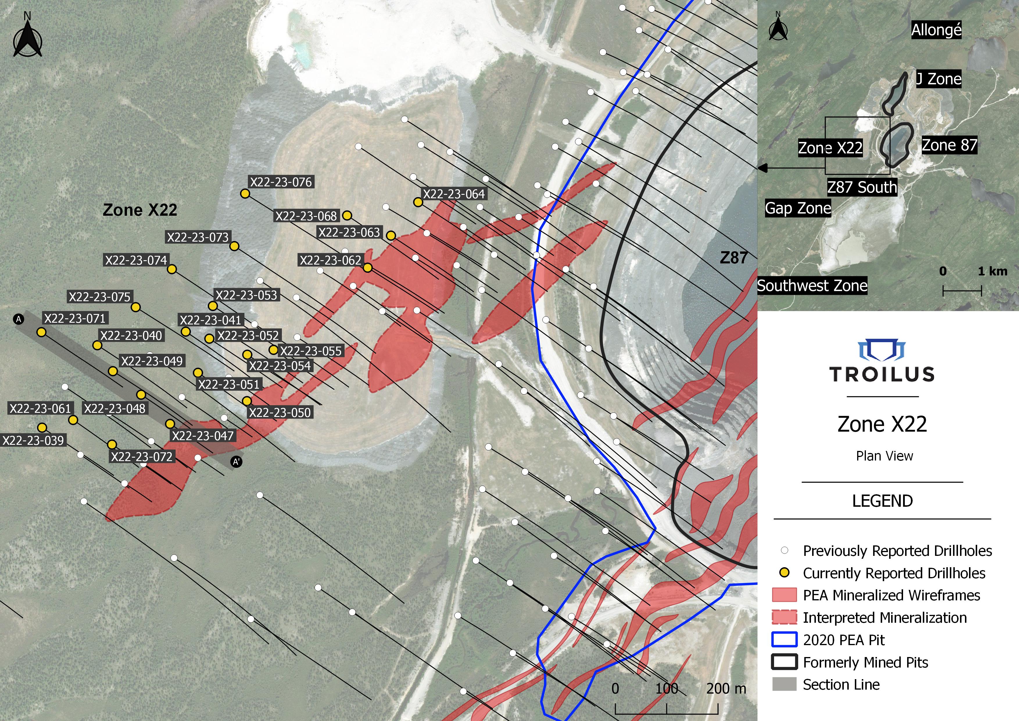 September 7, 2023, Montreal, Quebec – Troilus Gold Corp. (“Troilus” or the “Company”, TSX: TLG; OTCQX: CHXMF) is pleased to report assay results from the X22 Zone (“X22”) at its Troilus Project, located in northcentral Quebec, Canada. The results herein are from the Company’s drill campaign at X22, a body of mineralization identified in late 2022 that originates at the Z87 open pit and extends to the southwest into the Gap Zone, which has rapidly defined and expanded a high-grade NE-SW deformation corridor that characterizes the zone.