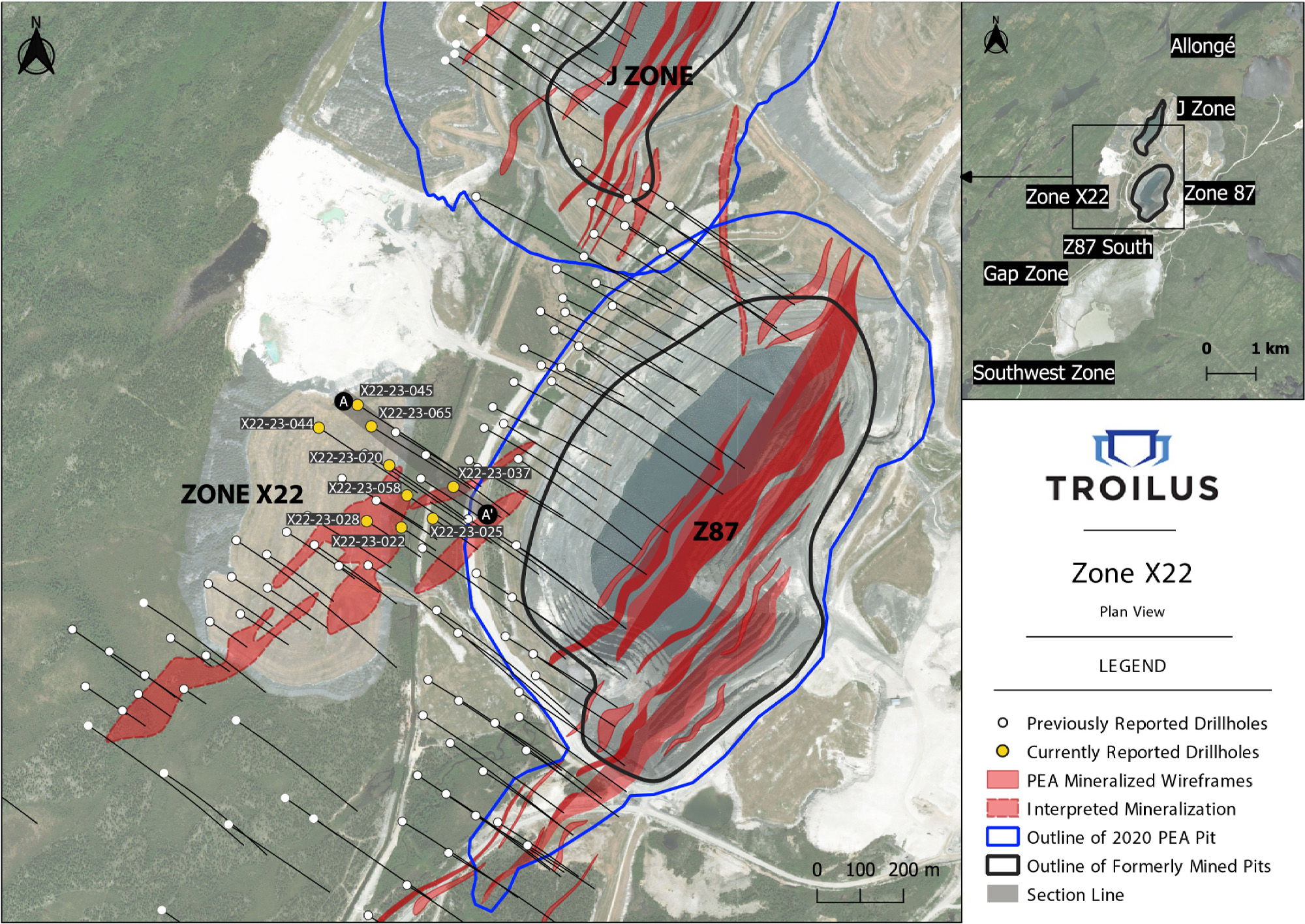 June 21, 2023, Montreal, Quebec – Troilus Gold Corp. (“Troilus” or the “Company”, TSX: TLG; OTCQX: CHXMF) reports assay results from Zone X22 (“X22”) at its Troilus Project, located in northcentral Quebec, Canada. The results herein are part of a 7,800-metre drill campaign completed in May 2023 at X22, designed to define and expand the mineralization of this NE-SW trending high-grade deformation corridor for inclusion in a Feasibility Study expected before year-end.