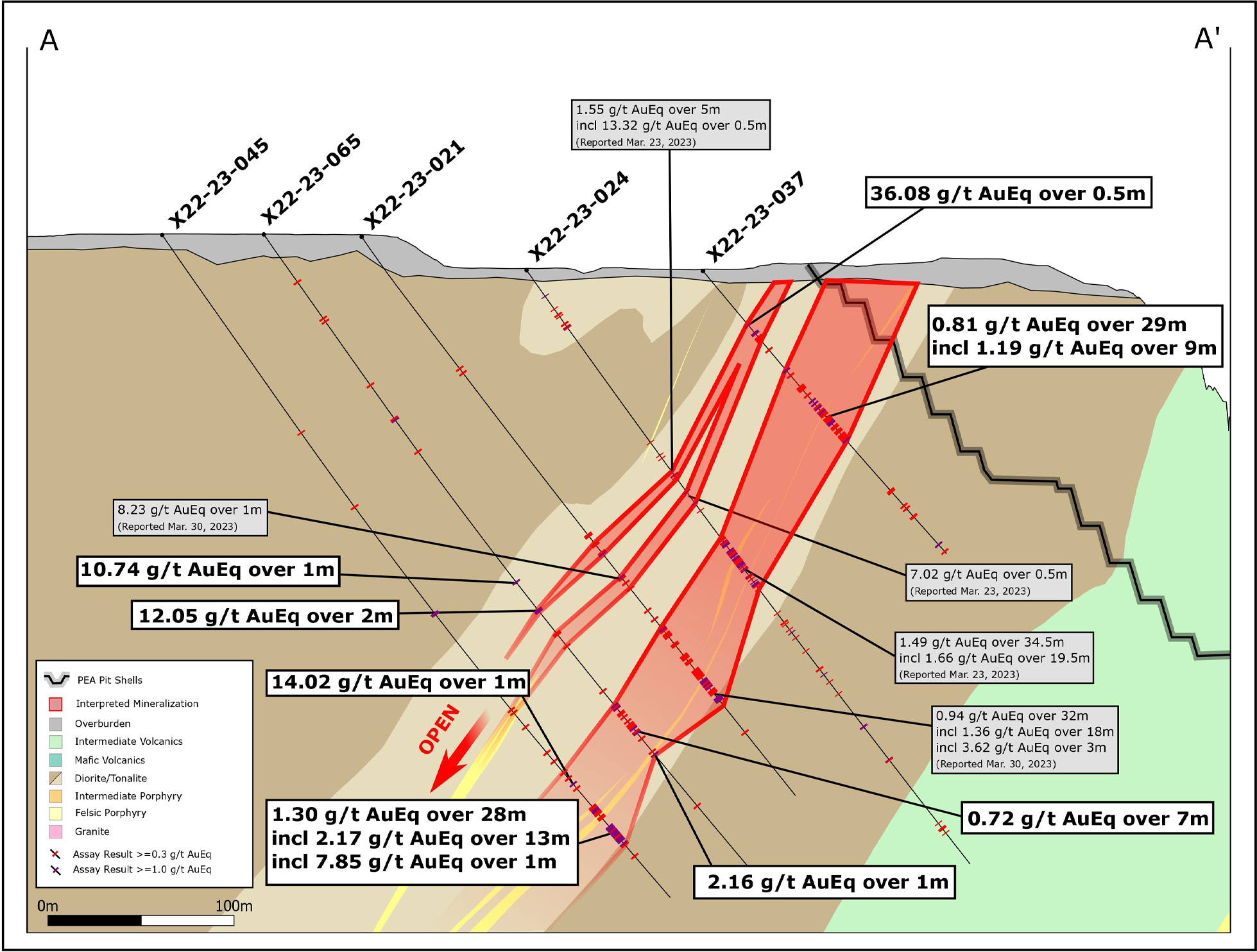 The results reported today were drilled in the northeastern most region of X22, proximal to the edge of the formerly mined Z87 open pit, confirming further mineral continuity of high-grade structures between new and previously reported drill holes (see plan view in Figure 1 and Section in Figure 2). All results reported today lie outside of the PEA pit shells and are intended to be included in the upcoming mineral resource estimate and Feasibility Study.