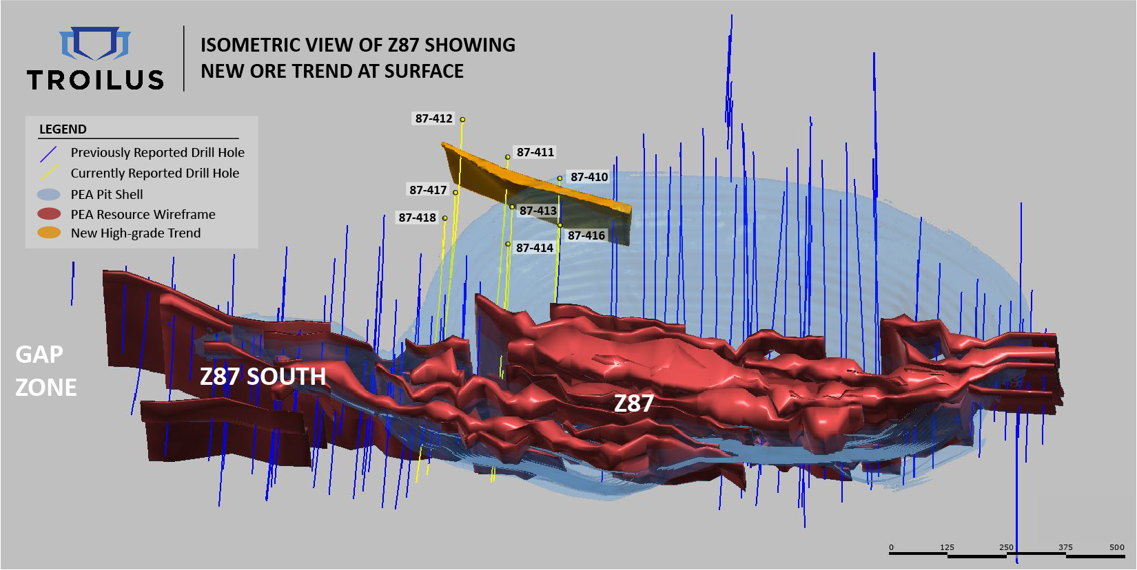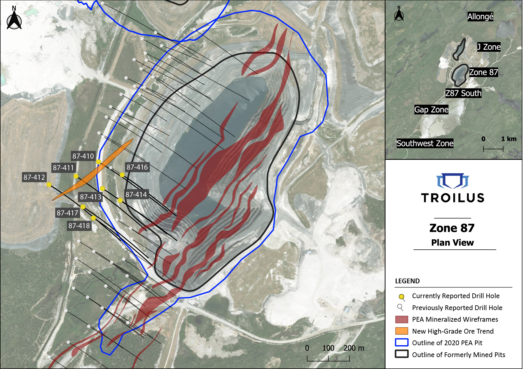 Justin Reid, CEO of Troilus Gold, commented, “We are thrilled about the exceptional high-grade drill results announced today, including those defining a brand new, shallow mineralized panel located just beyond the pit shell modelled in our PEA. We expect these results to have a significant impact on the economic modelling of the project since we believe both the grades and widths of the new discovery in Z87, along with its proximity to the main deposit, have the potential to immediately enhance the project’s grade profile, notwithstanding any further definition. It also reconfirms the imperative for ongoing exploration efforts across the project as part of our commitment to deliver value to all our shareholders, as these have consistently expanded the orebody across all main zones. As a result of these positive technical developments, coupled with cost and timing considerations, management has refocused its engineering efforts towards a definitive feasibility study which we expect to deliver in H2 2023 following the completion of the Z87 panel drilling. This decision allows our exploration team to continue aggressive drilling and further define areas of mineralization along this corridor that remain open to expansion, including today’s high-grade discovery. Management believes its decision to focus on delivering a feasibility study, rather than the anticipated pre-feasibility study will ultimately result in the delivery of a better, more accurate economic study to its stakeholders.”