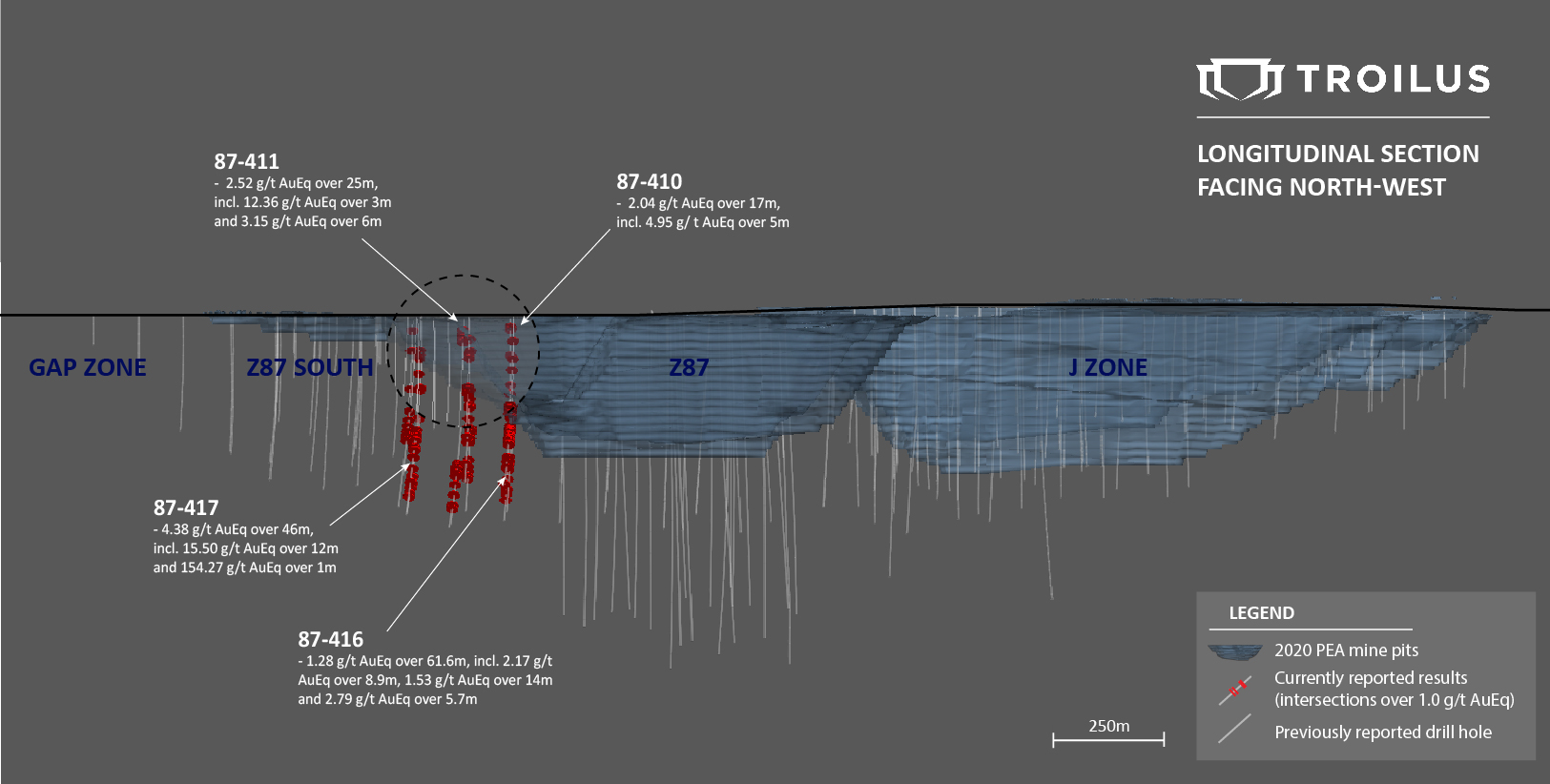 The results reported today are among the thickest and most continuous high grades identified at the Project and includes the single highest-grade interval ever drilled at the Troilus Mine site. Furthermore, a new shallow and high-grade panel of mineralization has been defined at the border of the Z87 PEA pit shell, which was not modelled in the Preliminary Economic Assessment (“PEA”; see PEA results press release dated August 31, 2020) nor considered as part of the pre-feasibility engineering work. This new panel West of Z87 has thus far been identified over a 300-metre strike length and remains open at depth and towards the Gap Zone. Highlights are reported below, while the complete results are presented in Table 1, and drill hole locations are shown in Figures 1 and 2. As a result of Troilus’ belief in the immediate impact of this new zone on the economics of the deposit, and after careful consideration, the Company will aggressively work on defining the impact of this shallow high-grade material, and as such intends to shift its engineering focus to the delivery of a Definitive Feasibility Study, rather than a pre-feasibility study as initially planned, that will incorporate these results. Further details on the status and delivery of the next engineering study is provided below.