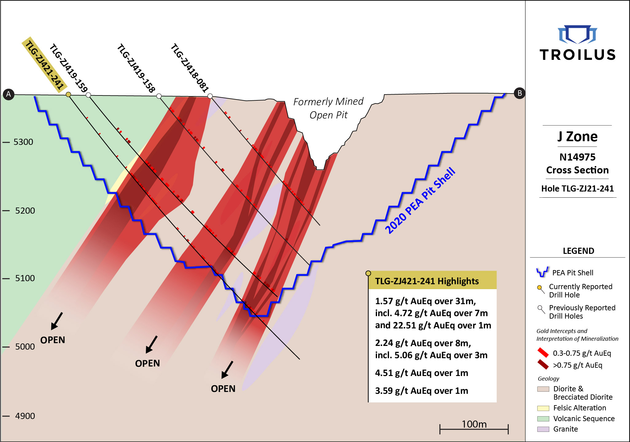 July 7, 2021, Toronto, Ontario – Troilus Gold Corp. (TSX: TLG; OTCQX: CHXMF) (“Troilus” or the “Company”) reports additional results from its ongoing exploration and infill drill program on its 100%-owned Troilus Gold Project (“Troilus” or the “Project”), which hosts one of the largest undeveloped gold and copper deposits in Quebec, Canada. New results have further expanded the western extension in the J Zone by another 150 metres to the northeast. The strike length of this new mineralized zone has grown from 200 metres to 850 metres since it was initially identified in May 2021 (See press releases dated May 12 and June 8, 2021). Additionally, several step-out holes extended down dip mineralization ~60 metres beyond what was previously known, and up to ~90 metres below the pit shell proposed in the Preliminary Economic Assessment (“PEA”) maintaining consistent and above average grades and thicknesses.