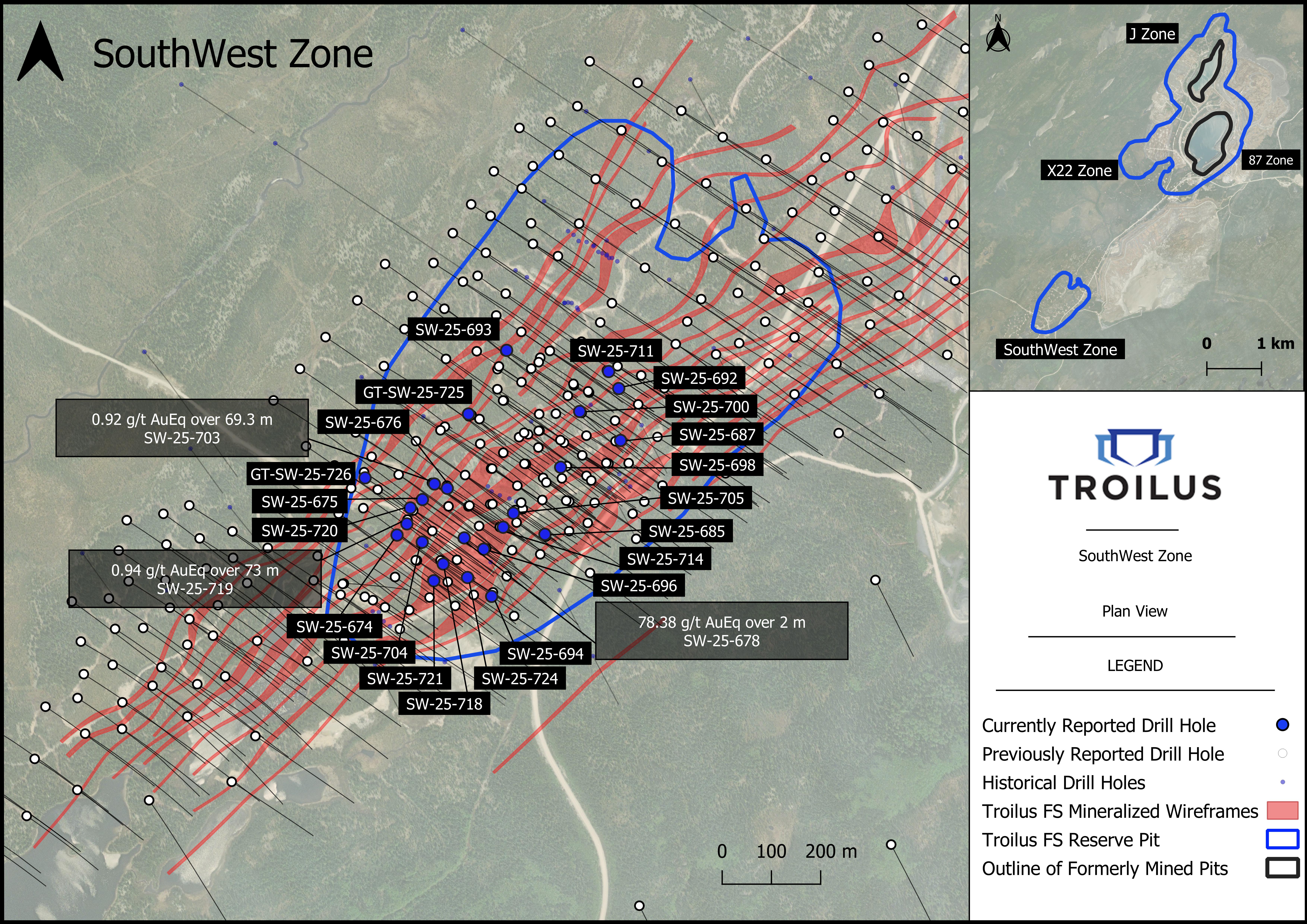 Justin Reid, CEO of Troilus, commented, “The 2025 drill campaign delivered exactly what we set out to achieve in providing greater confidence in the block model and the discovery of additional high grade mineralization. With Phase 1 of mining focused on the Southwest Zone in years 1-5, these newly identified high-grade ounces could be particularly impactful. Our geology team continues to interpret results and is confident in the opportunity for further growth. As we advance toward a construction decision, these results help de-risk the project and reinforces its long-term value.”