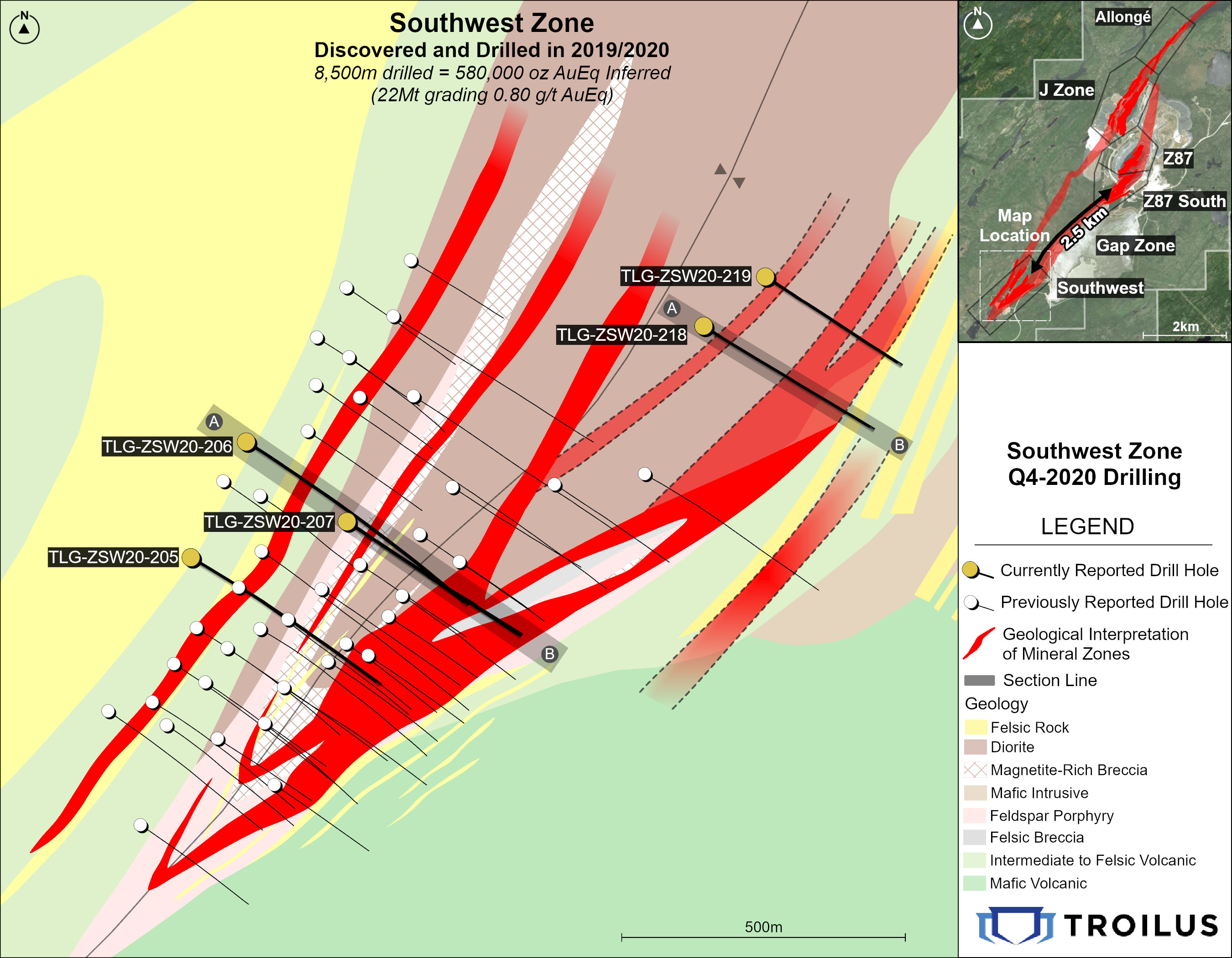April 8, 2021, Toronto, Ontario – Troilus Gold Corp. (TSX: TLG; OTCQB: CHXMF) (“Troilus” or the “Company”) reports assay results for an additional five drill holes from the Southwest Zone on its 100%-owned Troilus Gold Project (“Troilus” or the “Project”) located in north central Quebec, Canada. The Southwest Zone is a rapidly expanding gold zone located approximately 2.5 kilometres southwest of the main mineral corridor (Z87 and J Zone), initially identified and drilled in late 2019 and early 2020 (See Figure 1).