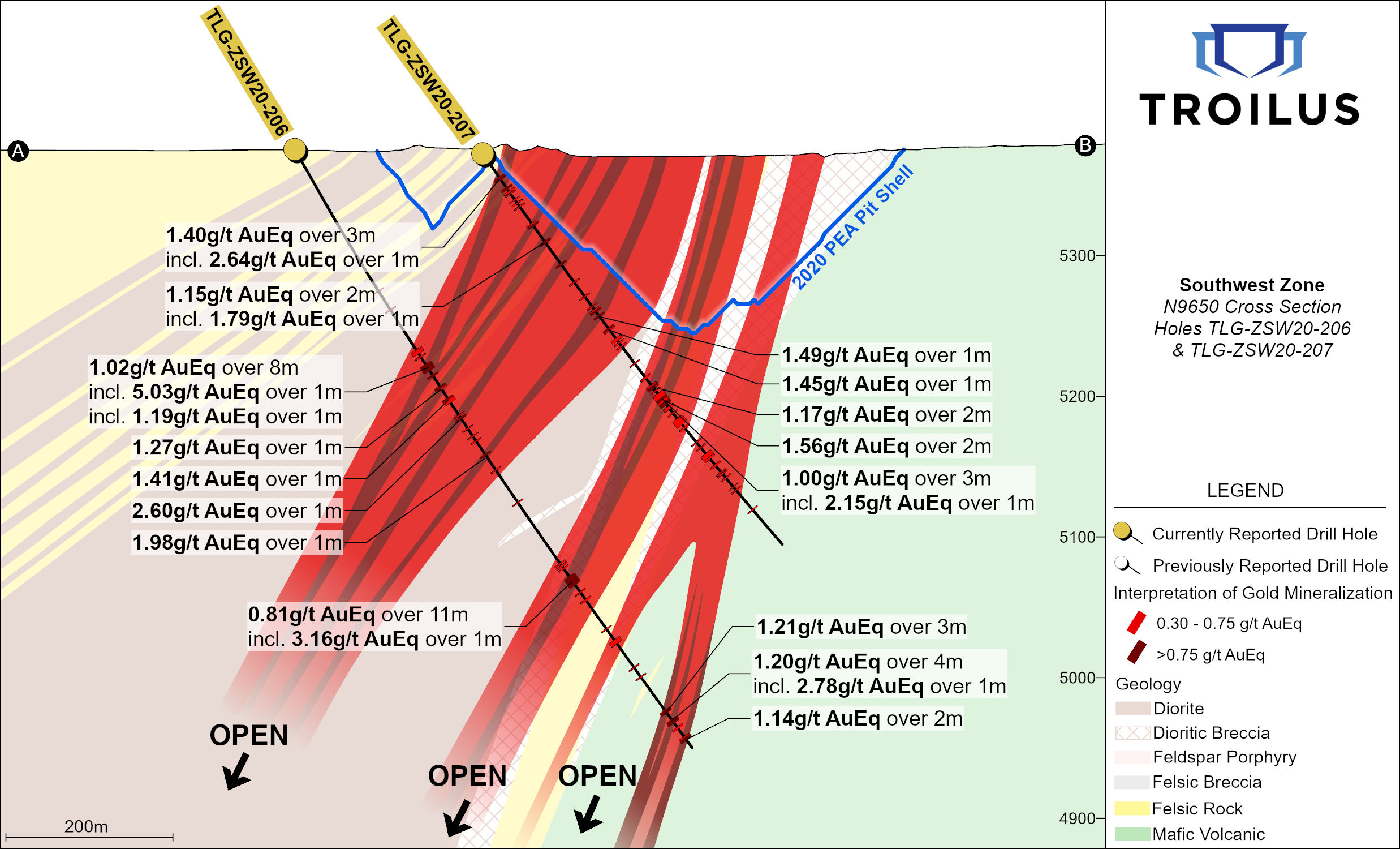 This Southwest Zone was initially discovered and drilled in late 2019 and early 2020 following new geologic modelling by Troilus’ technical team. A mere 8,500 metres drilled in this zone contributed an estimated Inferred resource of 580,000 oz AuEq (22.6 Mt, at avg. grade of 0.80 g/t AuEq) to the total mineral resource estimate of 4.96 Moz AuEq Indicated (177 Mt with an average grade of 0.87 g/t AuEq) and 3.15 Moz AuEq Inferred (116.7 Mt with an average grade of 0.84 g/t AuEq) (see press release announcing the latest mineral resource estimate dated July 28, 2020). In the coming months, Troilus intends to conduct infill drilling in the Southwest Zone, which will be required in order for all the newly identified zones of mineralization to be included into an updated mineral resource estimate and Pre-Feasibility Study, currently targeted for completion in the second half of 2021.
