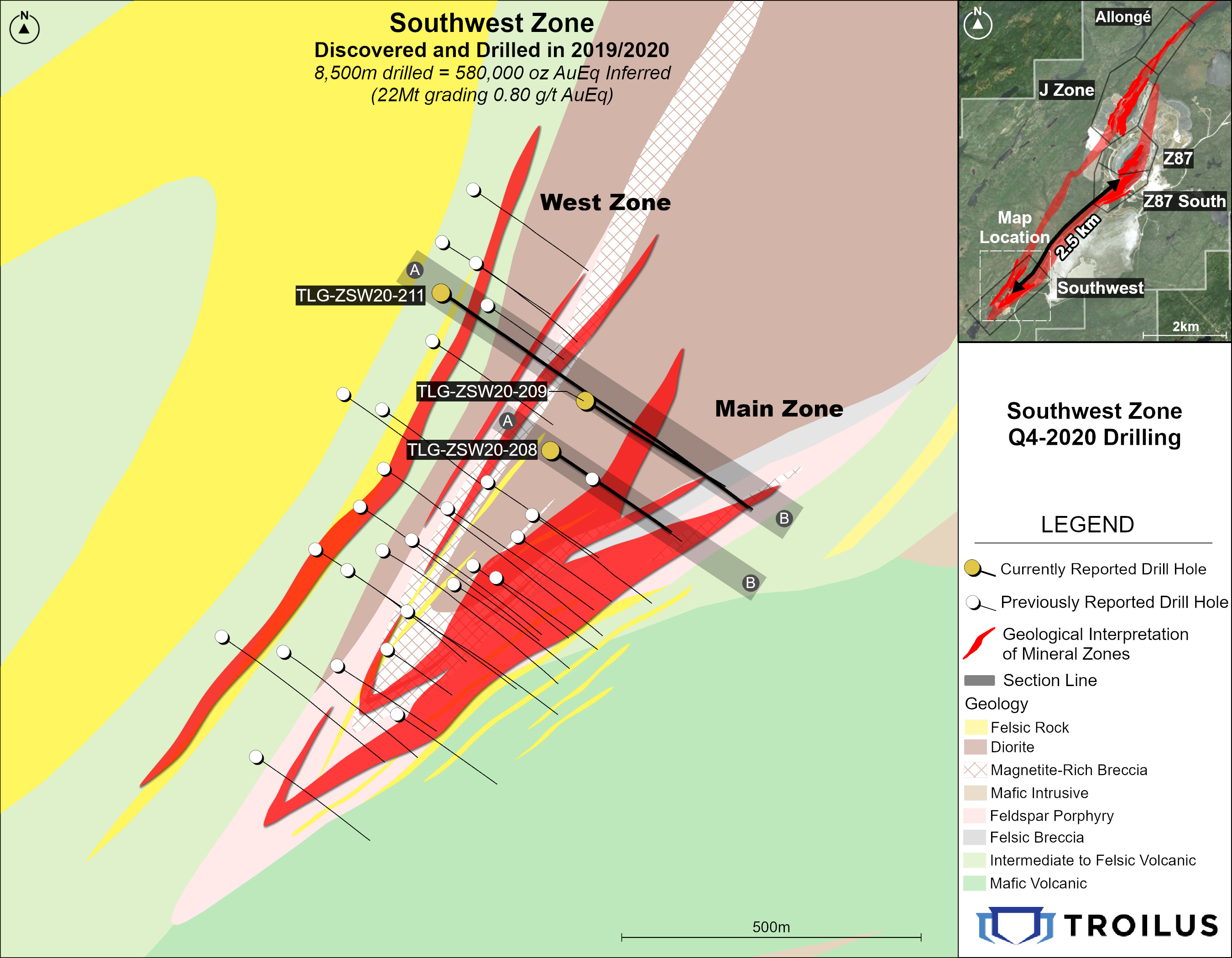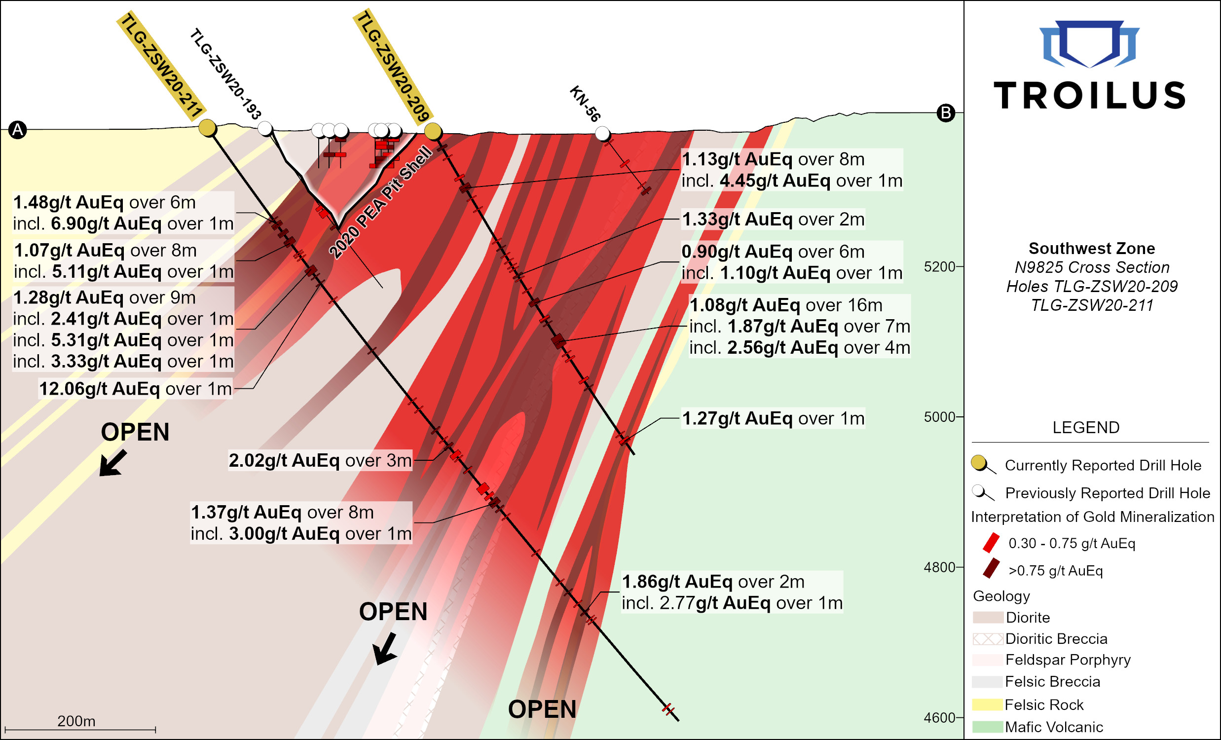“These continued positive results in the Southwest Zone are demonstrating a potential scale that is exceeding our expectations”, stated Justin Reid, CEO of Troilus Gold. “The results from holes 209 and 211 have defined an expanded mineral system that dwarfs the pit shell proposed in the PEA completed last year with strong extensions of mineralization all located within 500m from surface. It’s very exciting to see the Southwest Zone rapidly evolving from its initial discovery just over 1 year ago. We are eager to continue targeted drilling in this area to better define the potential of what could rapidly become a very large system with multi-million ounce resource potential of a scale we believe could be in-line with the main zone Z87, or potentially larger.”