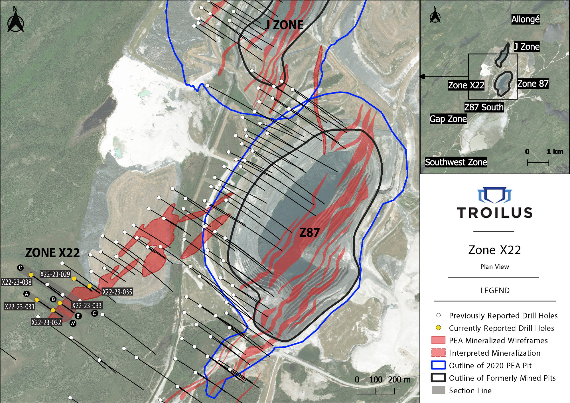 MAY 9, 2023, Montreal, Quebec – Troilus Gold Corp. (“Troilus” or the “Company”) (TSX: TLG; OTCQX: CHXMF; FSE: CM5R) reports assay results from Zone X22 (“X22”) at its Troilus Project, located in northcentral Quebec, Canada.