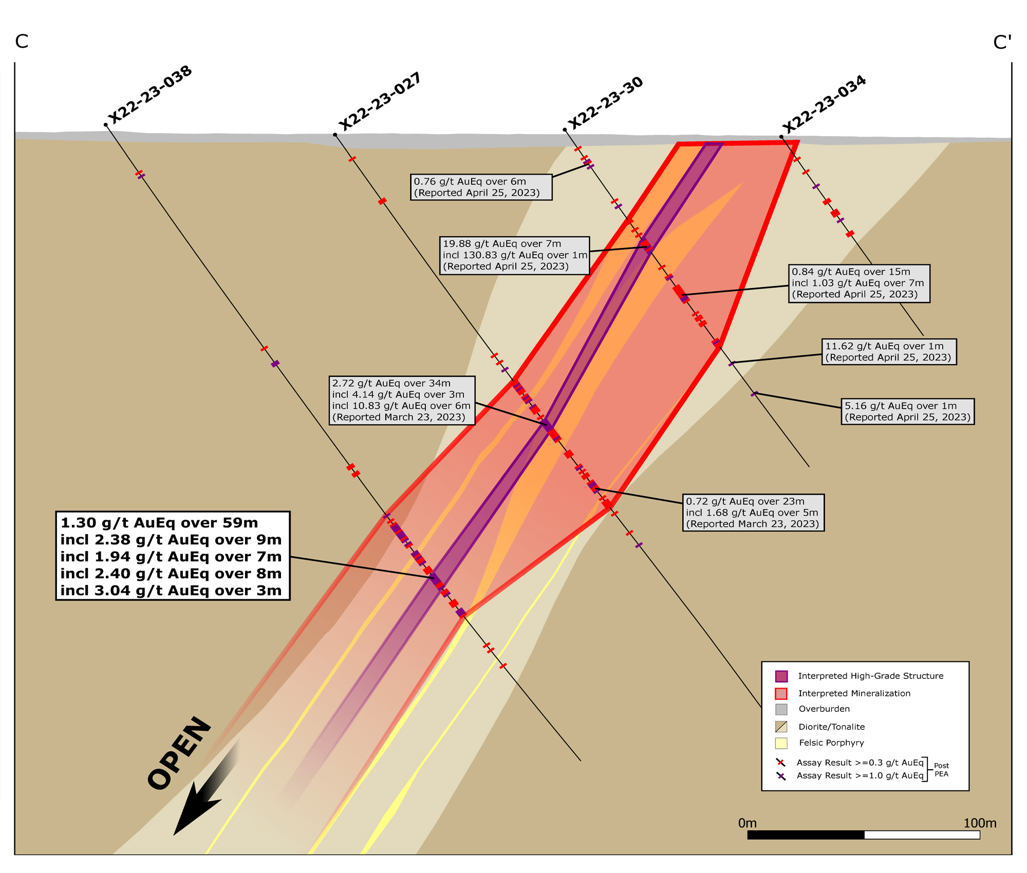 Figure 2 – Section 12,575N (C - C’ Figure 1) Facing North Showing Results for Hole X22-23-038