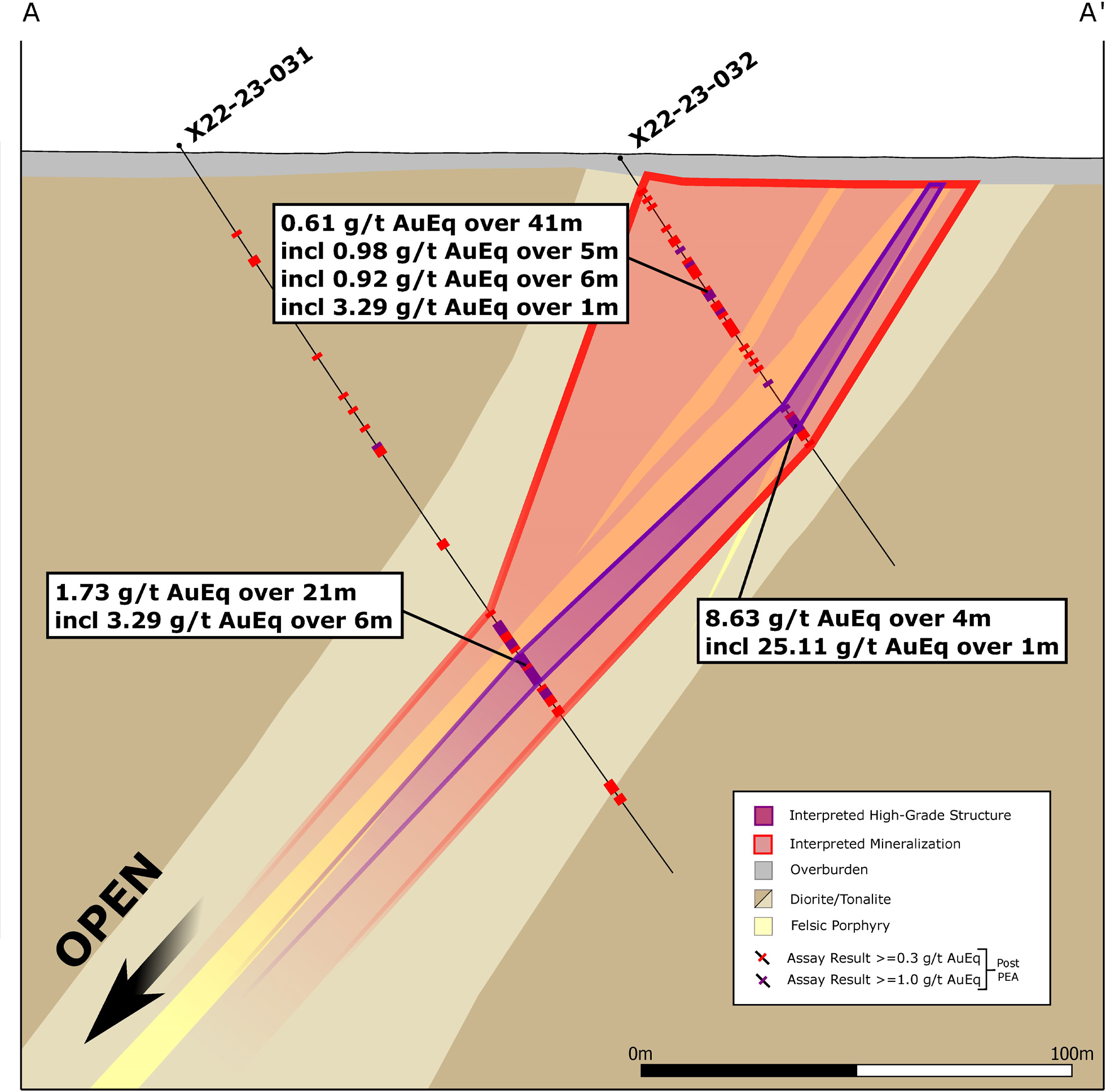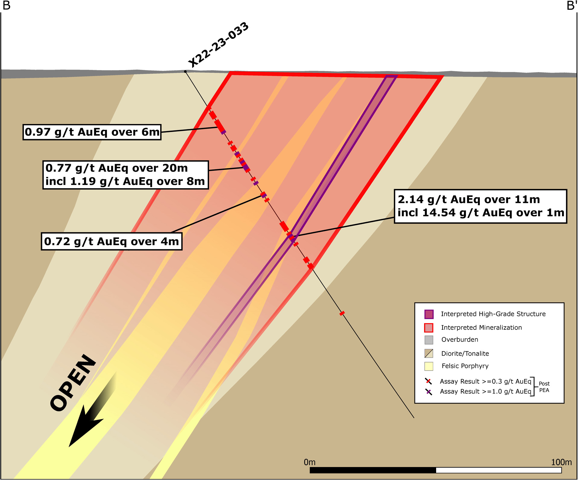 Results from X22 have continued to demonstrate high-grade mineralization near surface over significant widths along its ~1 kilometre strike length and remain open to expansion. Today’s results highlight the southernmost section of the X22 mineralized trend and its anomalous high-grade structures which have further delineated the zone and demonstrated mineral continuity between previously drilled and reported holes. High-grade material in this area of X22 is characterized by semi-massive to massive sulfide veins comprised dominantly of chalcopyrite, pyrrhotite and pyrite, with local sphalerite and galena, within highly sheared and potassically altered (biotite and sericite) tonalite and felsic porphyry dykes.