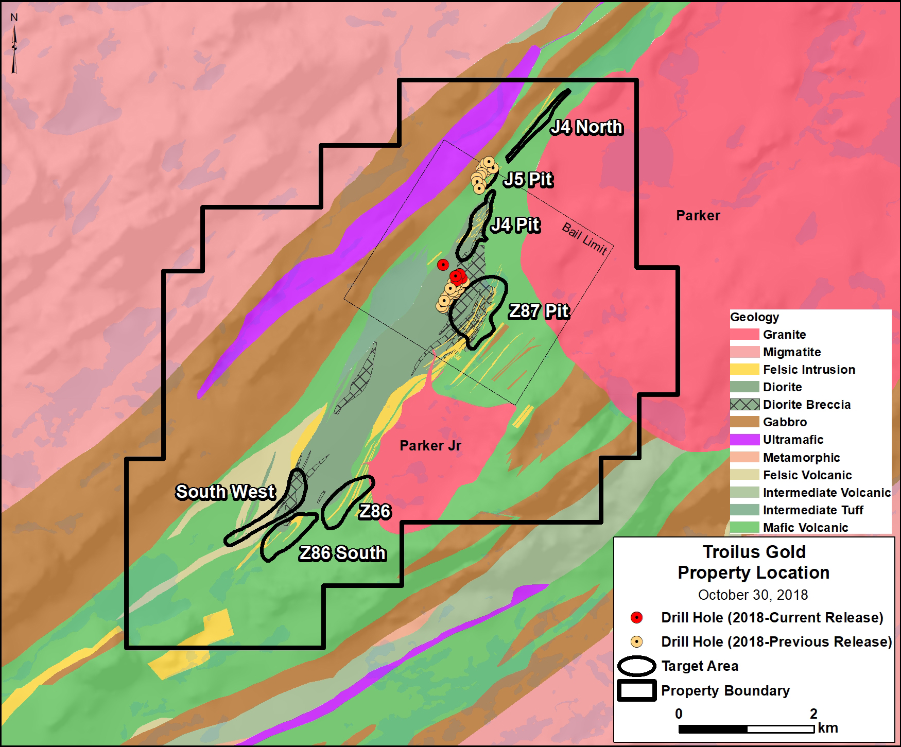 October 31, 2018, Toronto, Ontario – Troilus Gold Corp. (TSX: TLG) (“Troilus” or the “Company”) is pleased to provide further drilling results from its 100% owned Troilus gold and copper property located Northeast of the Val-d’Or district in Quebec, Canada (the “Troilus Project”). The 36,000 metre drill program was designed to confirm and expand existing mineral resources from the historically producing Troilus mine, as well as explore down dip and along strike from known mineralization.
