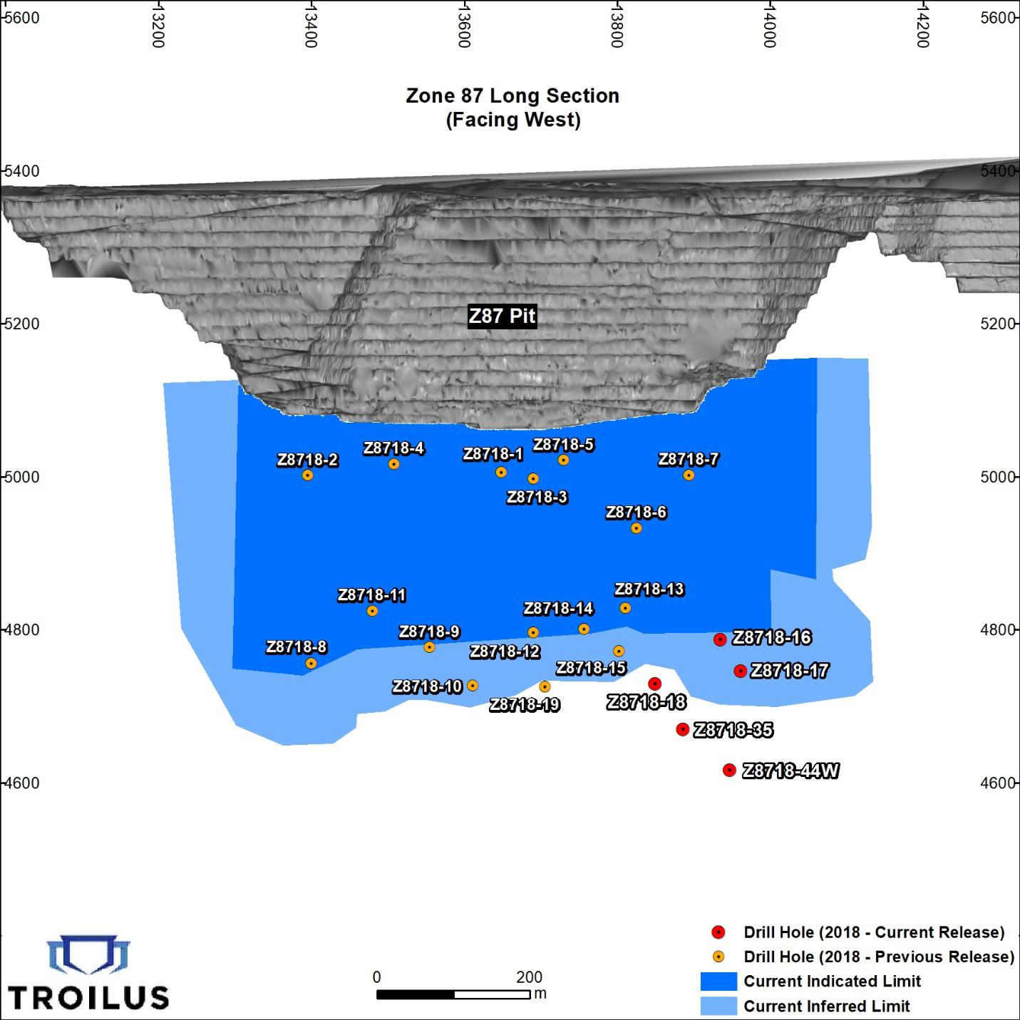 From 1996 to 2010, Z87 produced the majority of the over 2 million ounces of gold and 70,000 tonnes of copper produced at the Troilus Project. The Z87 pit was ultimately 350 metres deep and had a strike of approximately 900 metres. The Z87 zone is the focus of the current underground estimated mineral resource, representing over 1.6 million ounces of indicated and 360,000 ounces of inferred material (Figure 5).