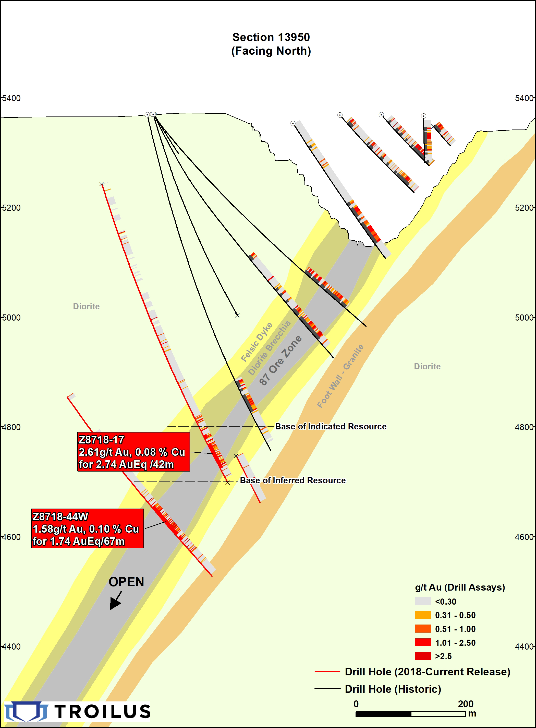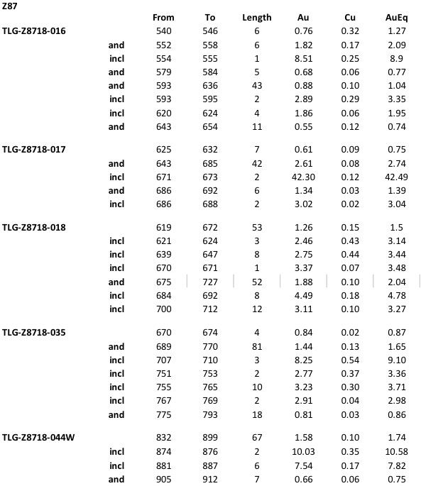 Three (3) holes, TLG-Z87-018, 035, and 044W, were targeted to test the down dip extension of mineralization below the current Z87 mineral resource estimates. All 3 holes successfully intersected gold and copper mineralization over expected widths and showed strong lithological continuity with the mineralized zones above. Continuation of mineralization has been extended an additional 180 metres below the lowest level of inferred categorized estimates and opened up opportunities directly to the North (Fig 2&4).