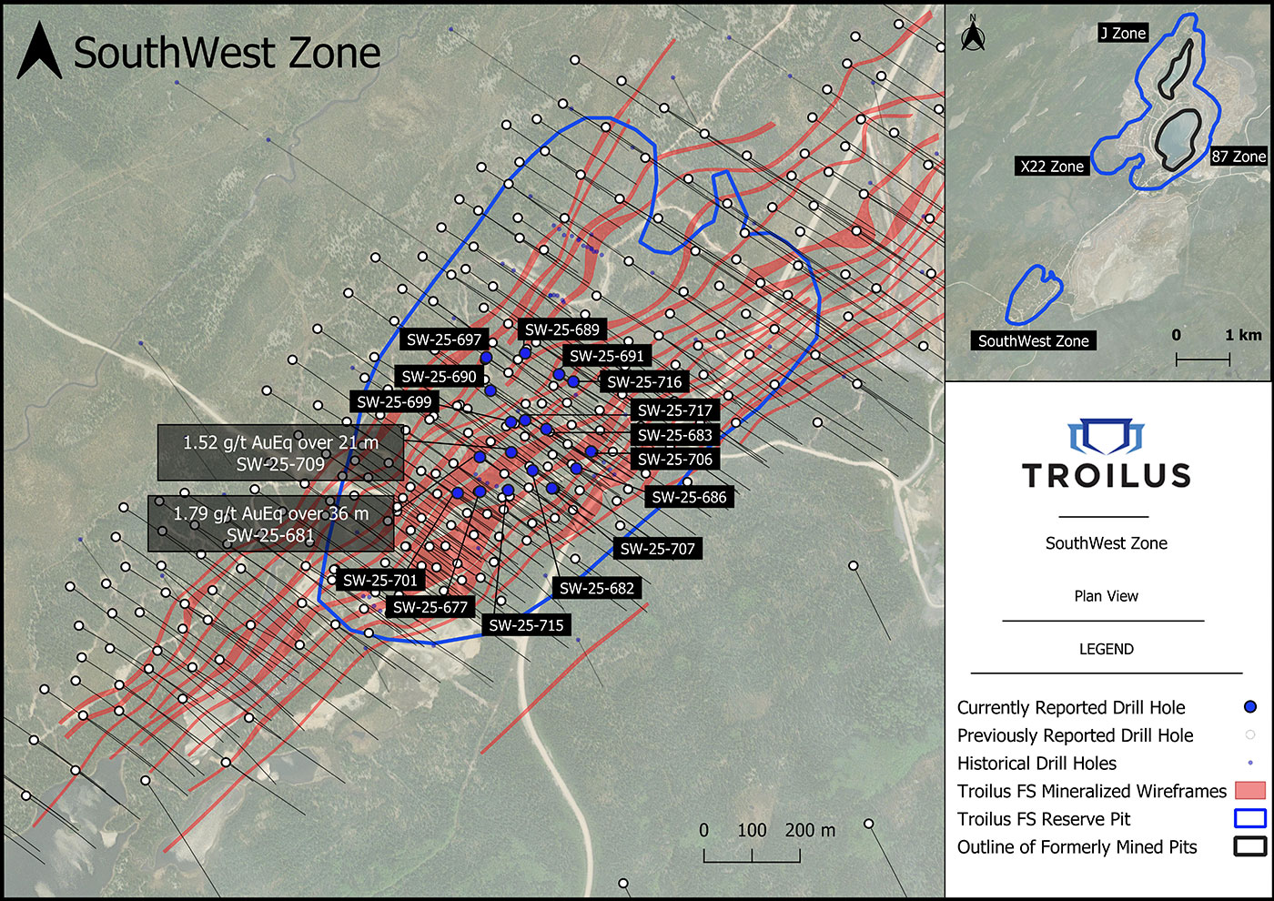 Justin Reid, CEO of Troilus Gold, commented, “We continue to be encouraged by the positive results reported from the Southwest Zone. Holes SW-25-681 and SW-25-709 have further highlighted the continuity of wide, high-grade mineralization, extending this system to surface. These results continue to de-risk and add confidence to the block model, and in doing so will allow optimization through re-interpretation of the high-grade zones in the Southwest Pit. With drilling now complete at the Southwest, we look forward to releasing the remaining results in the coming weeks, which will continue to provide additional confidence in the block model and help to de-risk the early years of production.”