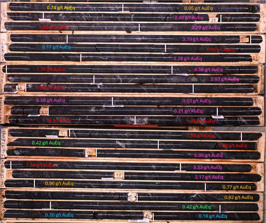 Figure 2. Core photos of hole SW-25-681 from 54 m to 85 m showing continuous nature of high-grade mineralization