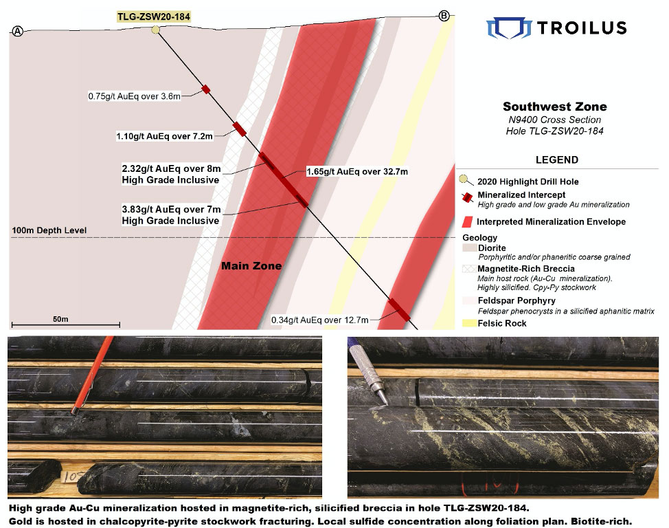 Justin Reid, Chief Executive Officer of Troilus commented: “Results from the small drill campaign in the Southwest Zone completed in December 2019 identified a sizeable new zone of mineralization 3.5 km southwest of the existing Z87 pit where almost 2 million ounces of gold was produced. The discovery of 2.87 g/t AuEq over 17 metres within a broader section of 2.26 g/t AuEq over 24 metres in hole TLG-ZSW19-177 (see press release dated January 28, 2020) prompted us to push forward with further exploration. We are very encouraged by these new results, which continues to expand the scale of the Troilus mineralizing system. It is our view that the Southwest Zone may have the potential to add to Troilus’ already compelling estimated mineral resource which includes 4.71 million ounces of Indicated gold equivalent and 1.76 million ounces of Inferred gold equivalent as announced in November of last year (see press release dated November 12, 2019). Our Technical team is now analyzing the Southwest Zone drill results with the intention of incorporating the findings into the overall resource estimate in the coming months.”