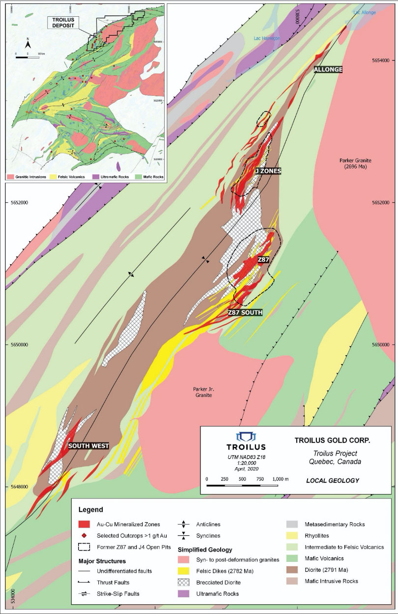 The Company’s technical team has applied the new geologic model derived from two years of successful drilling and analysis at Z87 and the J-Zone to the broader Troilus property resulting in the discovery of the Southwest Zone. Diorite, brecciated diorite and felsic dikes occurring within the main Troilus zones are shown to extend further S-SW, to the Southwest Zone. The February program encompassed seventeen (17) diamond drill holes, adding to the results from the seven holes drilled in late 2019, all of which successfully intersected gold at shallow depths including high-grade intersections and demonstrated geology similar to that of Z87 (see press release dated January 28, 2020). These results confirm a more than 1 km mineralized trend.