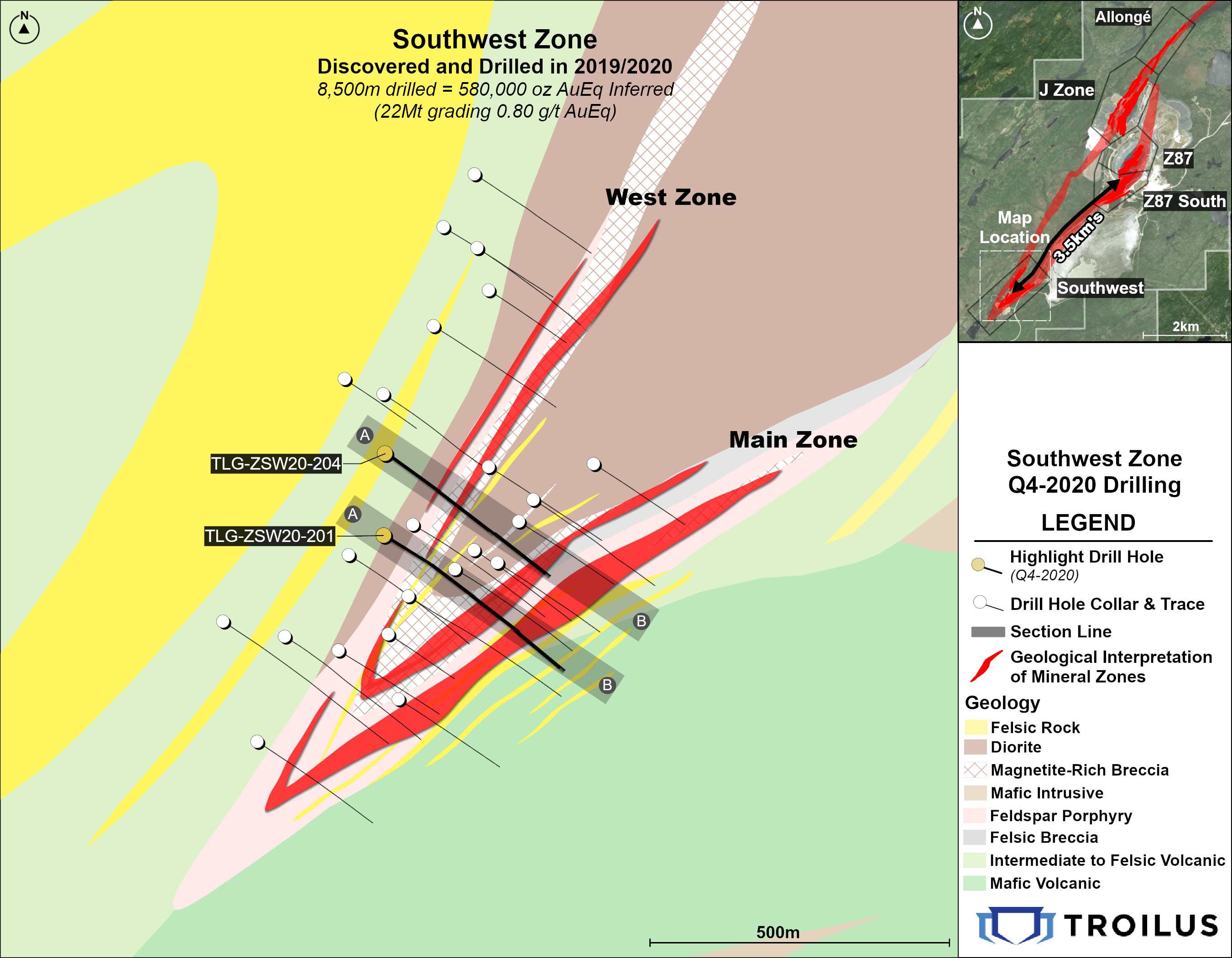 Drill holes reported herein show significant extensions of gold mineralization beyond the PEA whittle pit published in 2020 (See press release dated August 31, 2020), which successfully outlined an estimated Inferred resource of 580,000 oz of gold equivalent (“AuEq”) ounces (22.6 Mt, at avg. grade of 0.80 g/t AuEq) in the Southwest Zone (“SWZ”) (See Figure 1). This new zone, initially discovered and drilled in late 2019 and early 2020, is located approximately 3 kilometres southwest of the former mine and main mineral resource area and is believed to represent one of the most important near-term mineral growth targets on the Troilus property.