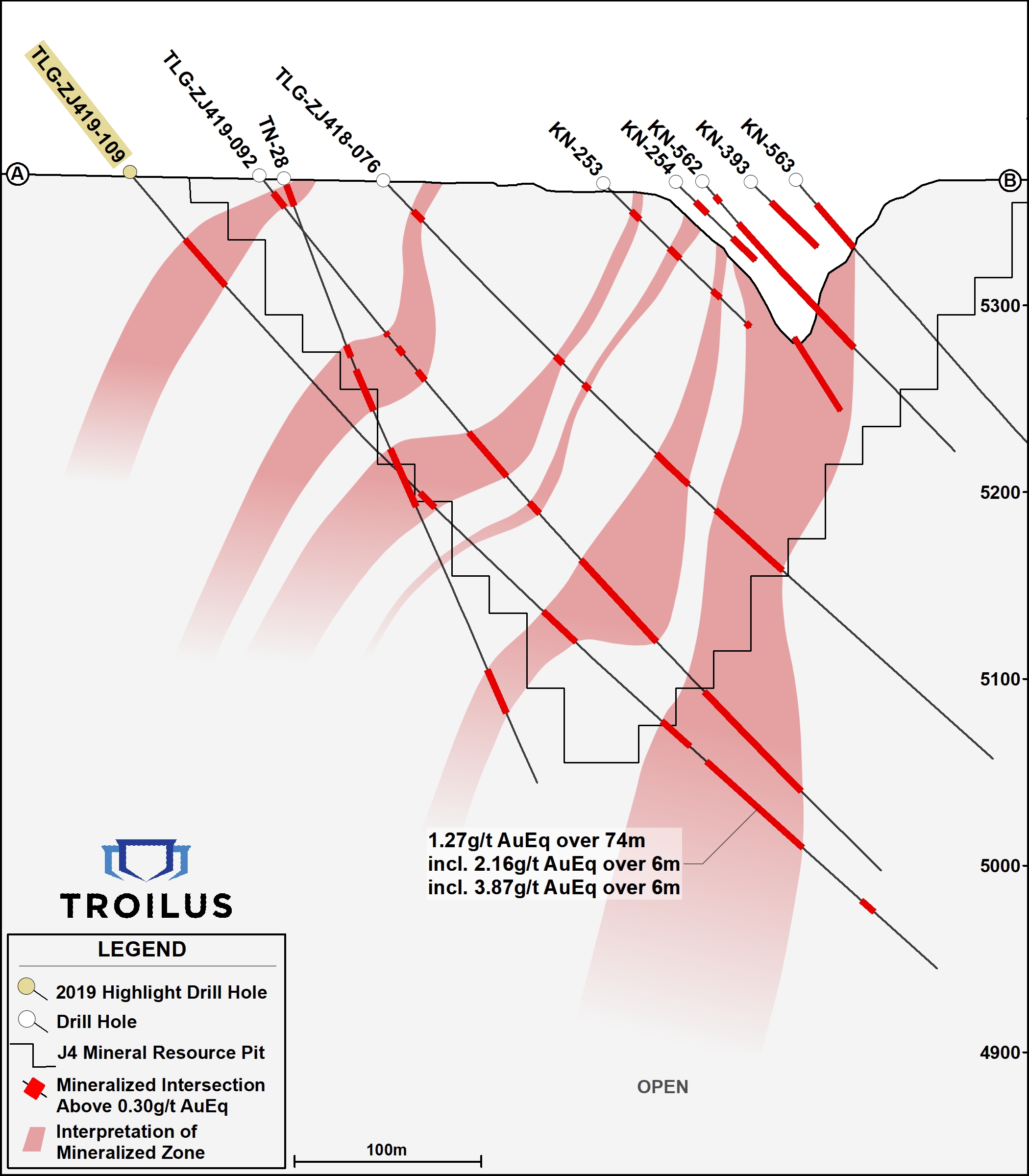 June 18, 2019, Toronto, Ontario – Troilus Gold Corp. (TSX: TLG; OTCQB: CHXMF) (“Troilus” or the “Company”) reports positive new drill results from its Troilus Gold Project, located within the Frotêt-Evans Greenstone Belt in Quebec, Canada. Approximately 40,000 metres of drilling are underway as part of the 2019 exploration program, focusing on expanding near-surface mineralization (in the J Zone and Z87 South areas) to support an open-pit mine scenario. New J4 results continue to support the trend of an expanding gold system that extends laterally along strike and down dip of known drilling.