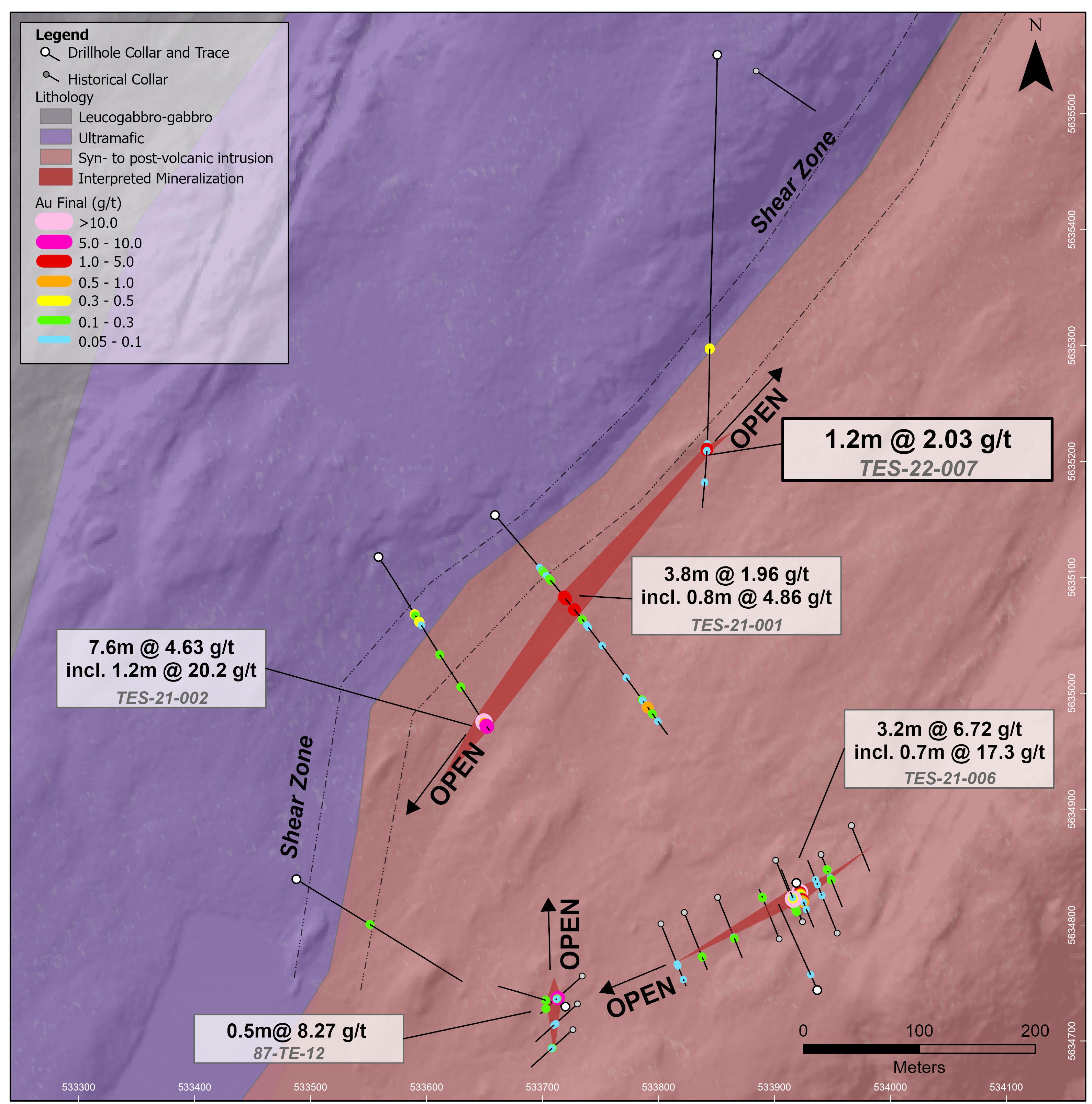 Approximately 600 metres were drilled at Testard as part of the 2022 regional program. On March 31, the Company reported strong gold intercepts at this target, including highlights of 4.63 g/t gold over 7.6 metres and 7.12 g/t gold over 1.4 metres. Today, the Company reports a new drill result of 1.31 g/t Au over 2 metres in hole TES-22-07 (from 522 to 524 metres down hole), which extended mineralization along a structural trend by 150 metres to the northeast beyond previously reported result of 1.96 g/t Au over 3.8 metres in hole TES-21-001 (See Figure 2).