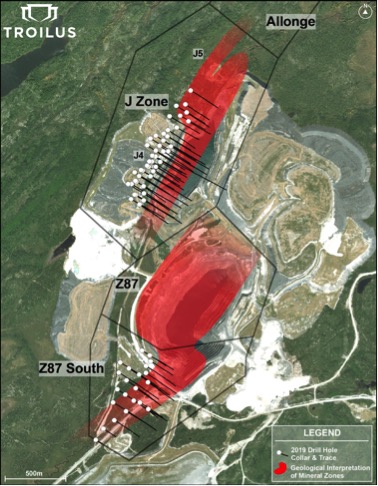 In the J Zone (J4 & J5), the 2019 drill program was primarily designed to expand near-surface mineralization to support an open-pit mine development scenario, while improving the geological understanding of the main mineral trend and identifying future growth opportunities. In the Z87 South Zone, the 2019 drill program was designed to follow-up on the positive holes drilled in this zone in 2018, while increasing drill resolution and improving the geological understanding of the main mineral trend on the property.